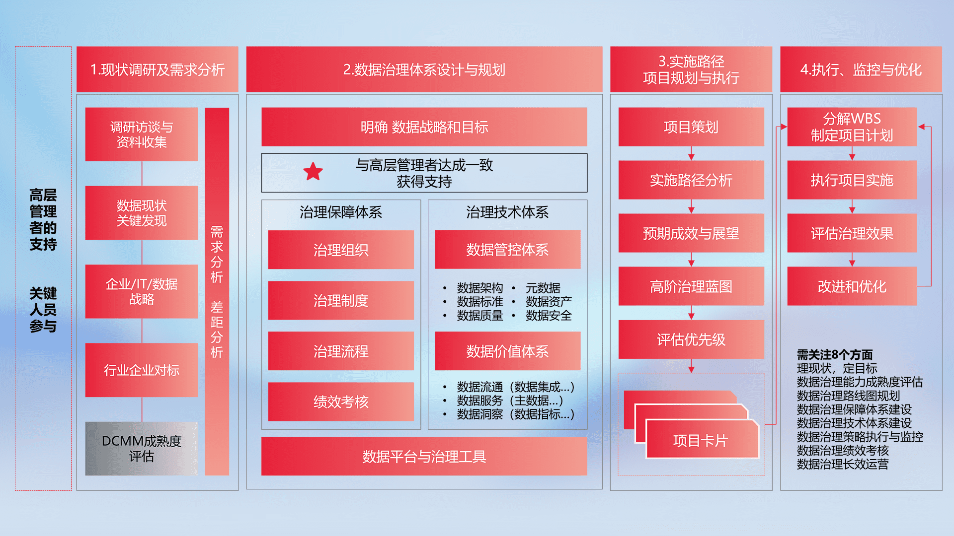 制定并执行统一的数据标准,,,,规范数据定义和格式,,,消除冗余和不一致性,,,,实现跨部门和跨系统的数据一致性,,,为企业提供标准化的数据基础。。