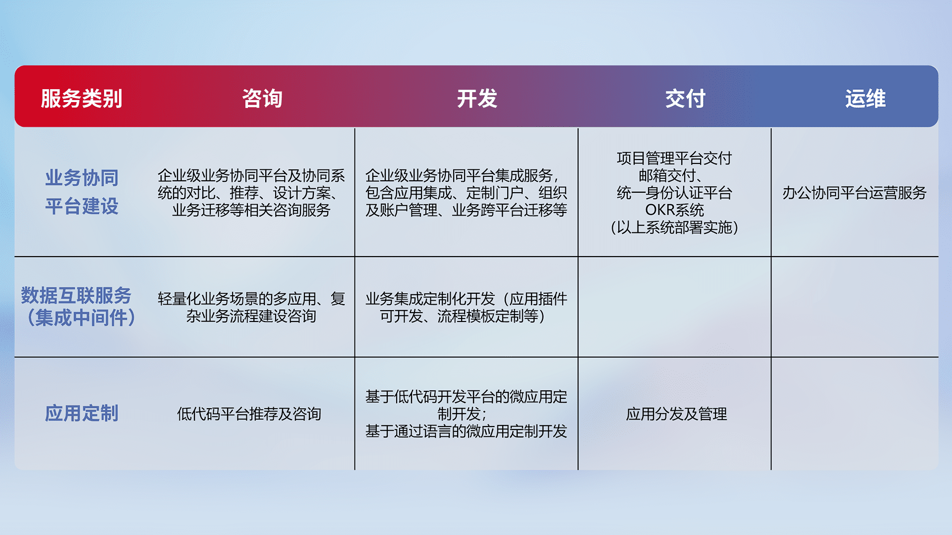 针对钉钉、、、企微、、、IDaas等平台级产品提供产品的规划、、、、方案、、交付、、、定制化开发等服务,,,实现如统一协同办公、、、、智能客户服务、、、、混合会议管理、、智能数据查询、、、等业务场景,,实现数字化转型。。。。