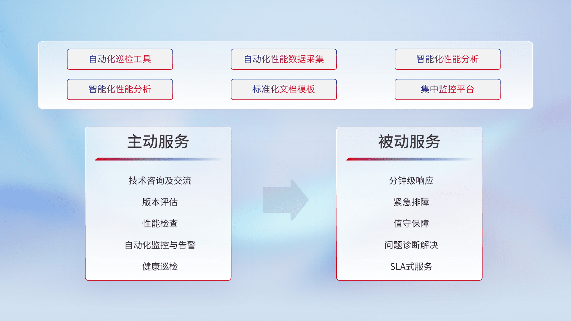 智能化工具和标准化文档,,,,保障服务质量,,,提供主动服务(包含技术咨询、、、版本评估、、、性能检查、、自动化监控与告警、、、健康巡检)和被动服务包含(分钟级响应、、、、紧急排障、、、值守保障、、、问题诊断解决、、、SLA服务)。。。